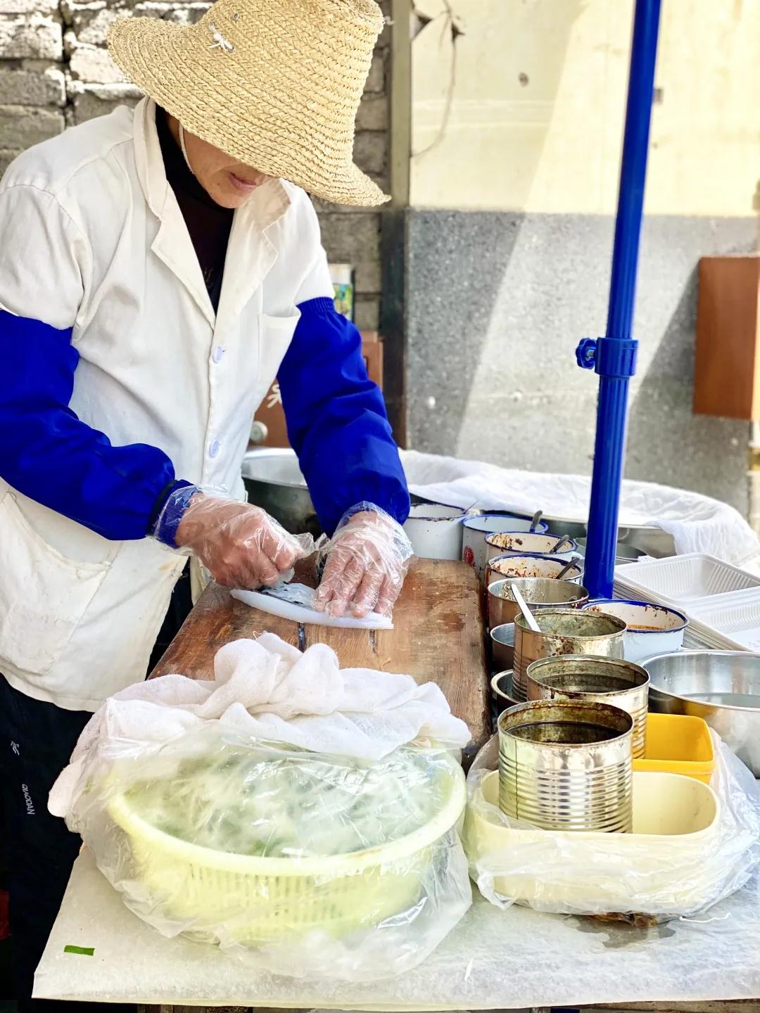 我們抵達時是下午兩點半,“涼粉就剩半份了,給你混一半面條哦。”嬢嬢邊用刀削涼粉邊回答,動作嫻熟,而后一絲不茍地添加各類調(diào)料。