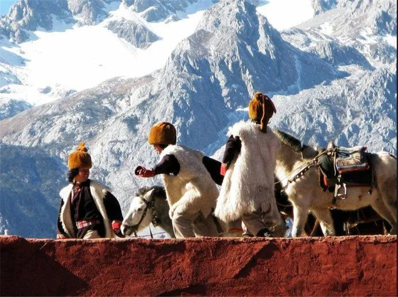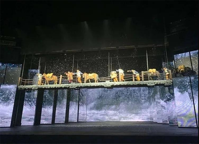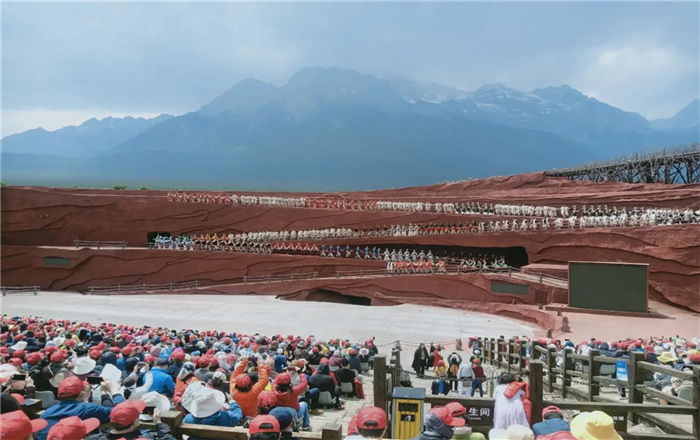 當你走進劇場,一個人工崖壁首先進入眼簾,它以美麗的玉龍雪山作為舞臺背景,當你在觀看表演時仿佛看到了六百年前茶馬古道上的剽悍馬幫穿行的場面,給你帶來的視覺沖擊力十分強勁。