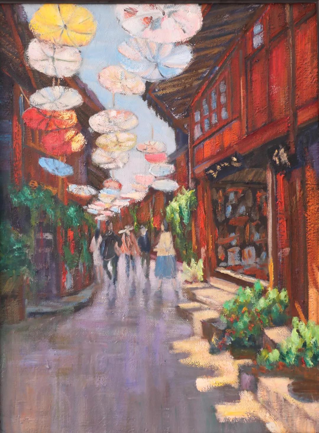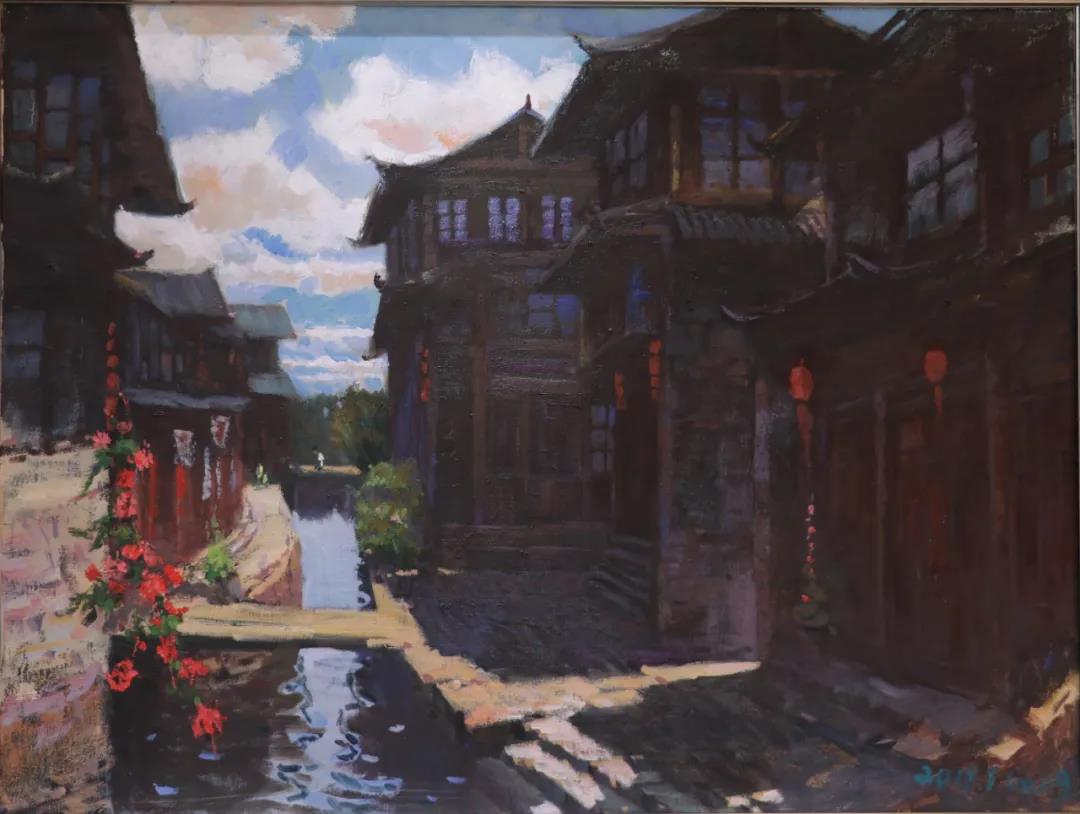 “烙畫很古樸也很適合用來畫古城,但總感覺用單色來表現古城的美還不夠,像藍天白云、朱紅大門就很適合用油畫來展現美感。”2010年初,陶剛開始嘗試畫油畫,這一畫便再也停不下來。