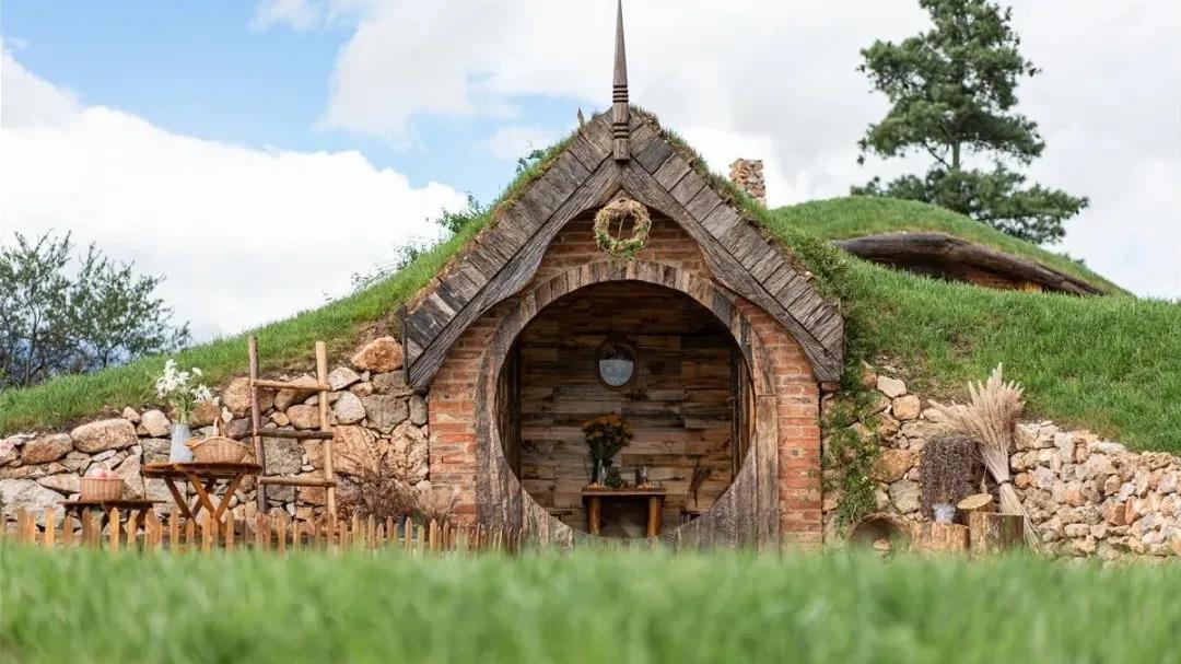 翠綠的小山坡上半圓形地洞木屋散落其間