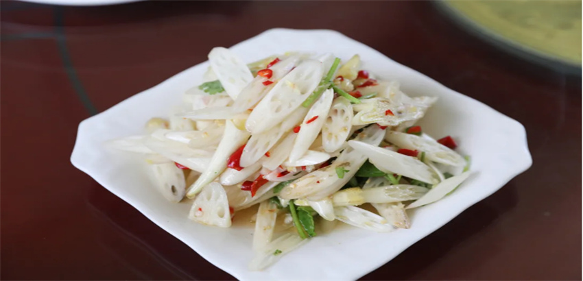 剛剛冒尖的藕芽從地里挖出,雖然已成藕的形狀,但口感卻像蔥段一樣清脆,在配上小米辣刺激著舌尖,這道涼拌藕芽必須是夏日首選。