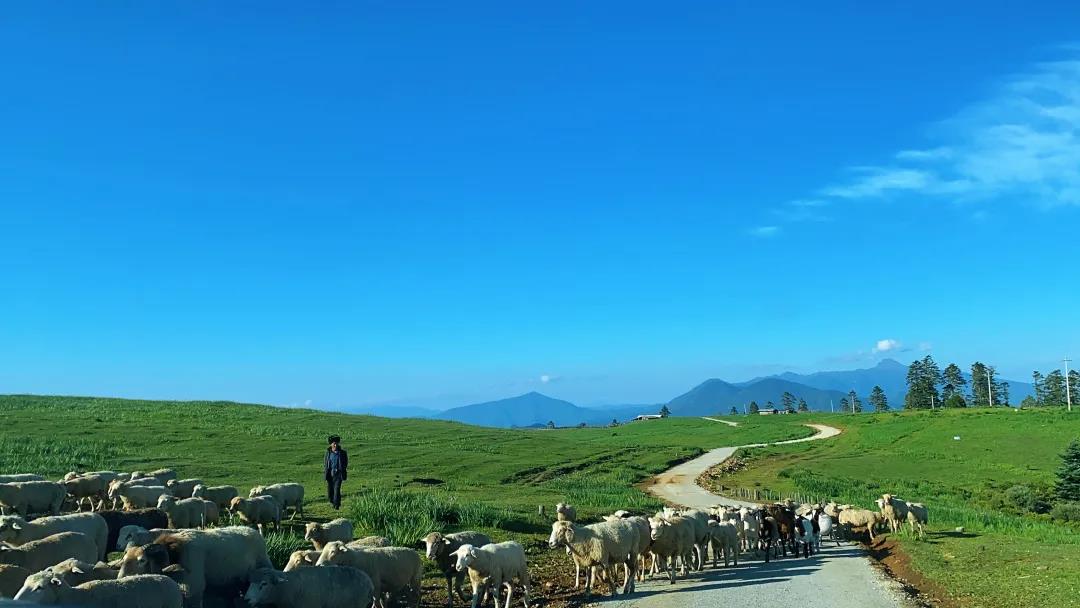 “咩咩咩……”一位老爺爺趕著羊群緩緩走來,機靈可愛的綿羊成群結隊,沐浴著陽光,吮吸著青草的芳香,開始了它們一天的覓食之旅,一路向上,直至消失在草地與藍天的交界線。