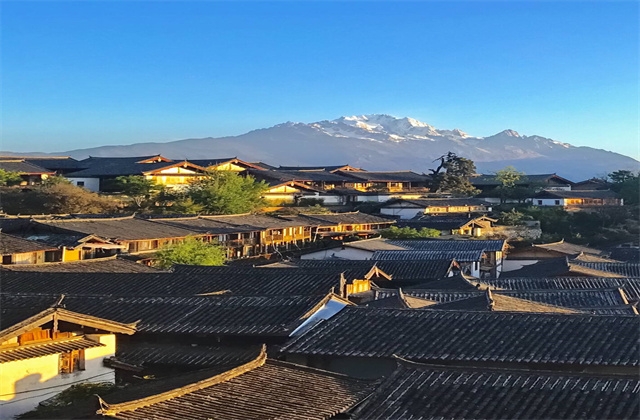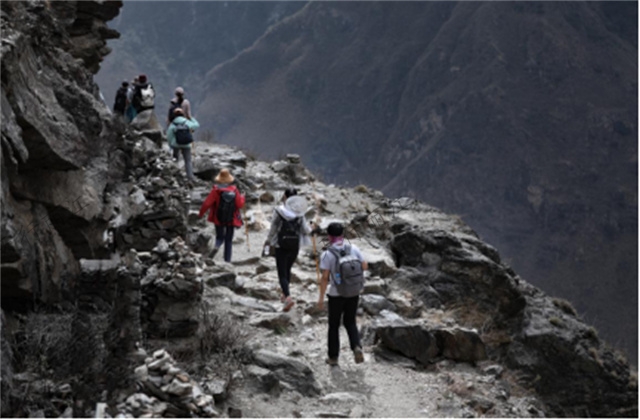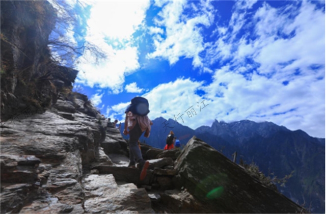 沿著高路步道繼續前行,一路走過驚險的崖邊步道,沿途盡是面朝玉龍雪山群峰,俯視雪山下的大峽谷,景色無比震撼。最后抵達本地灣入住今晚的客棧,天氣好的情況下可以欣賞玉龍雪山的日落與夜晚的無盡星空