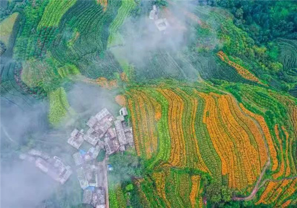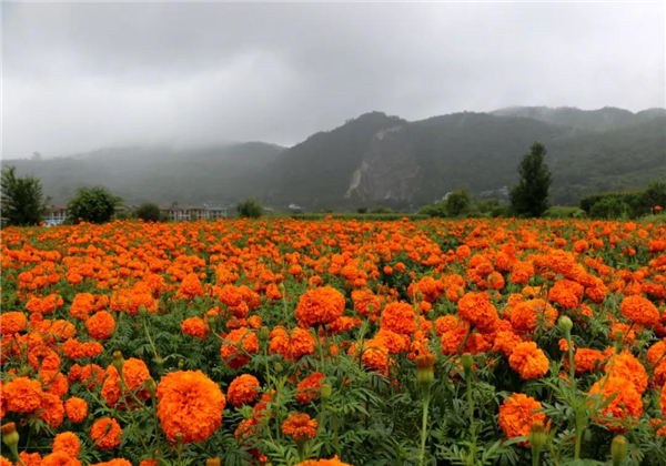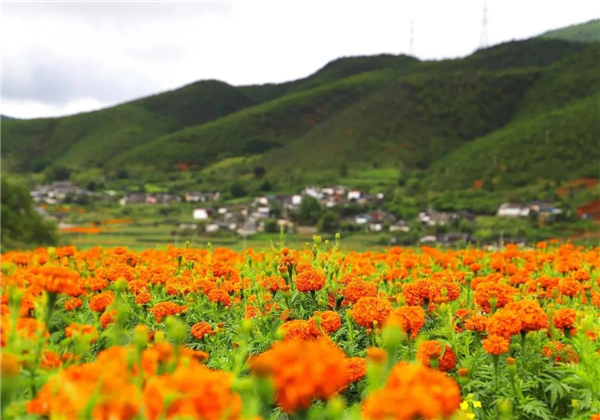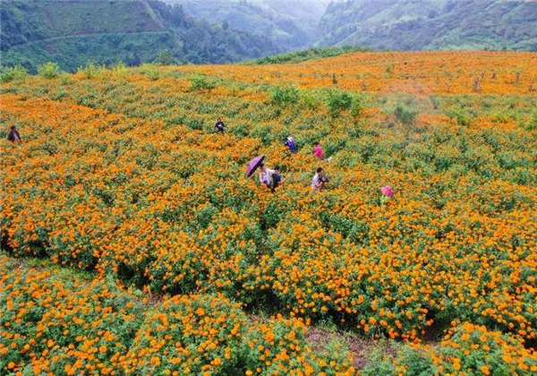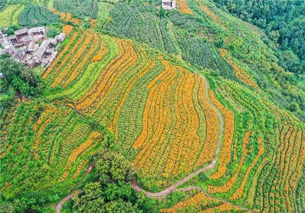 走進維新村的田間地頭到處都是漫山遍野的橘黃色花簇錯落有致,連綿起伏成了鄉村田野上一道靚麗的風景線。