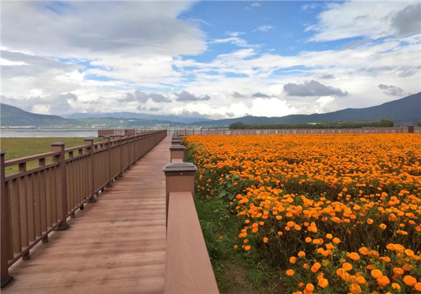 在海埂棧道遠觀只見那橘黃色的花朵一簇簇,一簇簇,正在迎風招展待走近,細細觀賞又覺姿態萬千,盡顯妖嬈。