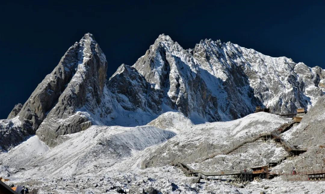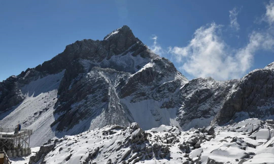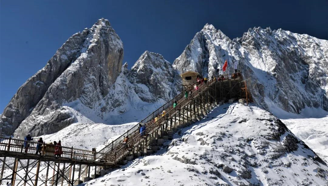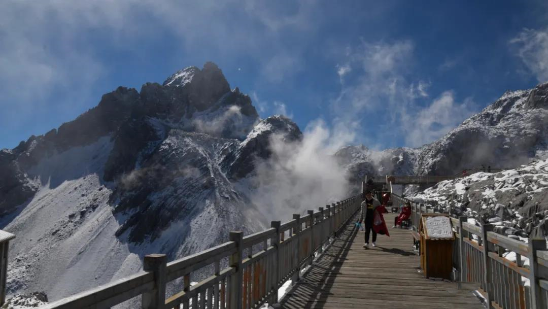 冰川公園位于海拔4506米扇子暴陡下方的冰川區,沿著木制棧道上升約180米,直到的觀景平臺,這是最近距離接近玉龍雪山冰川的觀景勝地。天氣晴好,向下一眼望去,那一汪深藍,便是著名的藍月谷了。