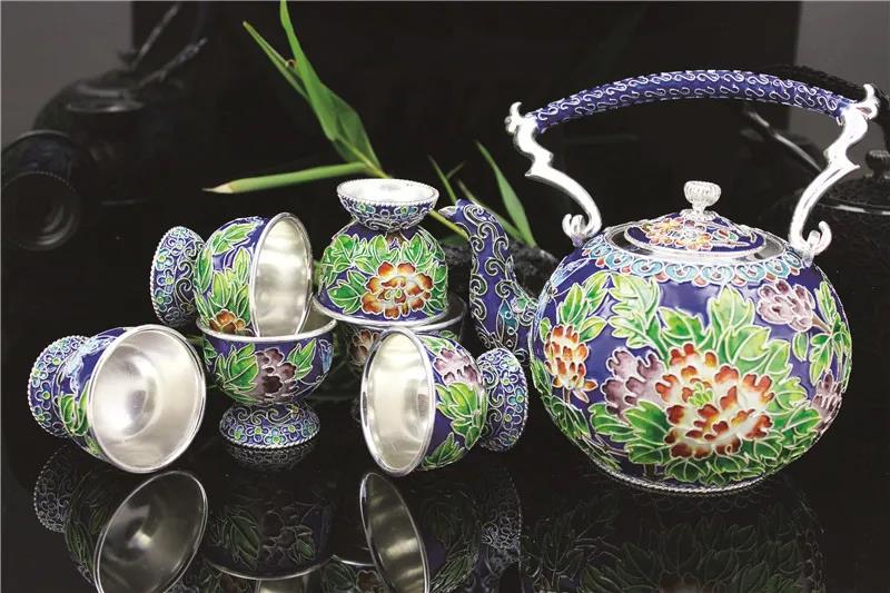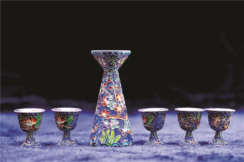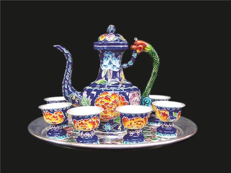 工藝流程共分為:制坯、掐絲、點藍、燒藍、檢驗、包裝六道程序,其中掐絲、點藍兩道程序最為費工。制品有茶具、餐具、首飾三個類別,如:耳環(huán)、手鐲、發(fā)簪、章盒、酒具、茶具等。紋飾多為中國漢族民間吉祥圖案,如:蝴蝶、牡丹、盤纏、綬帶和喜鵲。