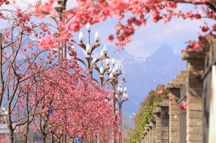 4月份正值春季,春天的麗江,萬物復蘇,雪山下的櫻花也如期而至了。每年的3-4月份,這里的街道便被一片粉紅給包圍,一朵朵盛開的櫻花在和煦的陽光下隨春風飄動著,偶有花瓣飄落在地面……