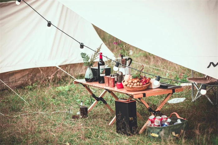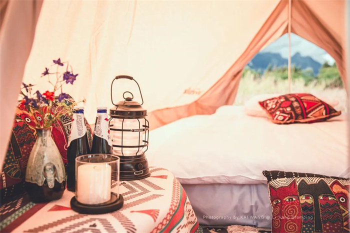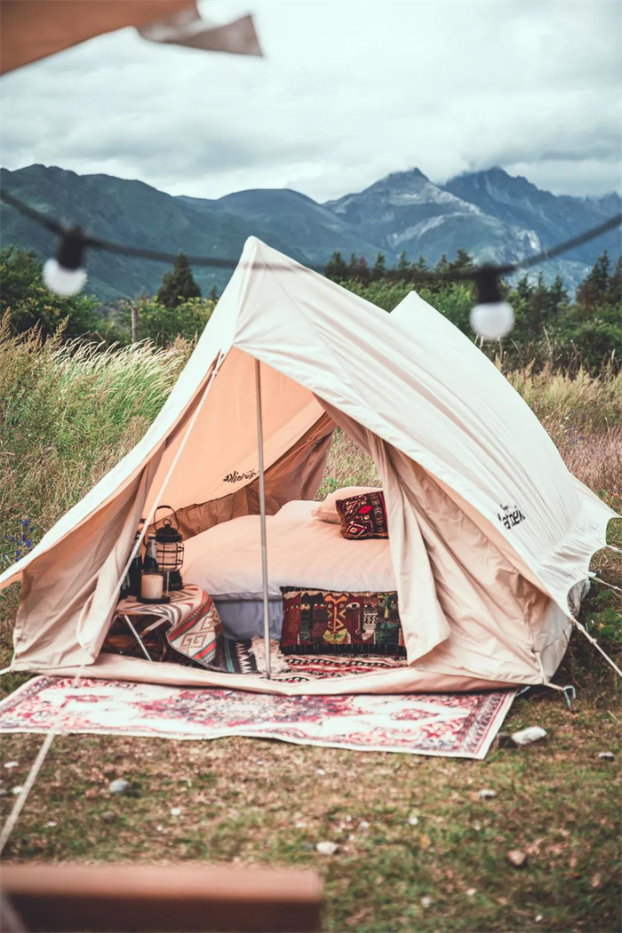很快就到達了營地,可以說是到達了夢想中的生活。在群山中藏著的一片空地,周圍一圈圈狗尾草,幾頂帳篷放置其間。在草地上鋪一塊毯子,往上一坐就是舒適愜意的田園隱居生活。