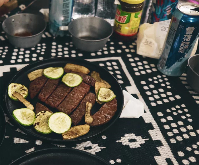 伙伴們展示自己手藝的時候也到了。隨著鍋碗瓢盆“哐啷”交錯的聲響,營地中開始彌漫著食材的香味。在營地中晚餐時,太陽日落西斜,一點點消失在夜空中,營地亮起了星星點點的燈光。