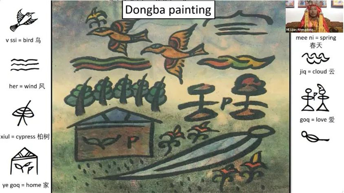 為慶祝聯(lián)合國第12個中文日,4月19日至21日,聯(lián)合國中國書會以“聚焦象形文字”為主題,在紐約總部舉辦了三場線上活動。分別介紹了良渚文化刻畫符號、東巴文和甲骨文三種象形文字,以及與之相關(guān)的良渚古城遺址、麗江古城和殷墟三個世界遺產(chǎn)地,以彰顯中國語言與文化魅力。在第二場線上活動《講座:神秘的東巴象形文》上,北京東巴文化藝術(shù)發(fā)展促進會邀請到東巴文化傳承人和麗軍和香港中文大學翻譯系助理教授、納西學研究者鄧彧共同講授東巴文。通過講解東巴典籍中的詞匯,讓觀眾了解故事內(nèi)容,并通過模擬情景對話讓觀眾學習游覽麗江時可能用到的常用語。