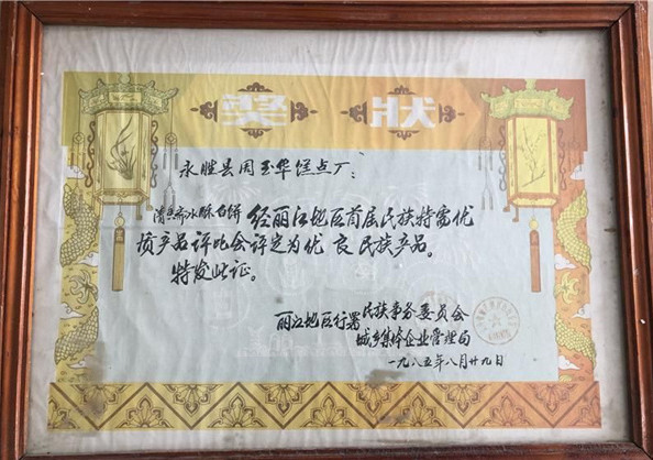 在30余年的傳承經(jīng)營中,周玉華不斷創(chuàng)新,增添品種、擴(kuò)大經(jīng)營、改進(jìn)包裝。目前,“清香齋”已有2家分店,學(xué)徒10余人,“清香齋”的產(chǎn)品也遠(yuǎn)銷北京、成都、昆明等地。據(jù)了解,早在1985年,“清香齋”就曾榮獲麗江行署頒發(fā)的“優(yōu)良民族特需優(yōu)良民族產(chǎn)品獎”;2015年,“清香齋”榮獲“最佳名特小吃獎”;近日,“清香齋”新產(chǎn)品松茸云腿餡水酥餅又獲得“云南省金牌月餅獎”;2017年6月,永勝縣水酥餅制作技藝被列入云南省第四批省級非物質(zhì)文化遺產(chǎn)代表性項(xiàng)目,水酥餅由此憑借著獨(dú)特的口味和制作工藝,遠(yuǎn)銷國內(nèi)外。