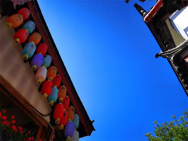 主街傍河、小巷臨渠,水是麗江古城的魂,四通八達(dá)的自然水系讓古城充滿了靈氣。清澈見(jiàn)底是常態(tài),偶爾能遇到兩條逆流而上的魚(yú),偶爾也會(huì)遇到水中自由招展的水草。漫步在石板路上,在潺潺的流水聲中,滿身的疲憊和倦意仿佛都被帶向了遠(yuǎn)方。冬日天生自帶一股靜謐感,流水之聲便越發(fā)清澈靈動(dòng)起來(lái)。如果聽(tīng)過(guò)一滴水經(jīng)過(guò)麗江的故事,那此刻,你一定在古城的流水里感受到了來(lái)自雪山的氣息,清冽中帶著勃勃生氣,奔騰著去往了春天的方向。如果你在這個(gè)冬天來(lái),借你一片最澄澈瓦藍(lán)的天空吧,讓你在平凡的日子里再怦然心動(dòng)一回。也許,麗江的藍(lán)天白云早已經(jīng)不是什么秘密了,可當(dāng)你踏足的那一刻,相信還是會(huì)嚇一跳,因?yàn)槎盏柠惤懦牵炜盏乃{(lán)又加深了一個(gè)度。