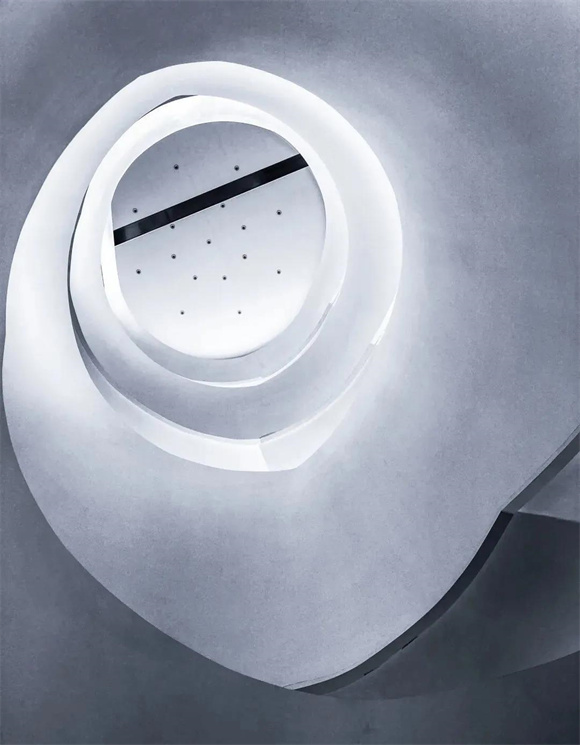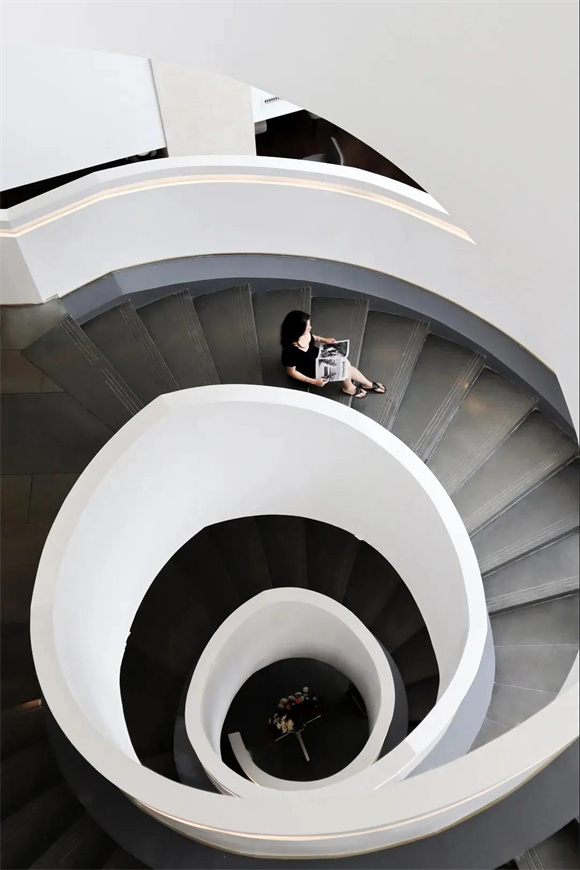 酒店內部尤為吸睛的當屬旋轉樓梯,純白的外衣散發著云貝般的光澤,溫暖的燈帶順著樓梯延展,優雅而頗具未來感。由下仰望,如云朵慢慢升騰;自上俯瞰,又如花朵悄然綻放,隨手一拍都是INS風爆棚的美照,儼然已成為酒店的網紅打卡點。