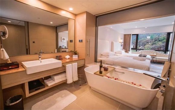 偌大的落地窗寬敞明亮,將窗外的風景引入室內。或遠眺玉龍雪山雪峰皚皚,或觀文筆山郁郁蔥蔥,或賞文筆海波光粼粼,或看庭院瀑布流水潺潺,讓你足不出戶也能欣賞不同風情。不僅如此,酒店還打造了十分有特色的庭院客房、觀星套房,無論是閑坐庭院坐享美景,還是臥室躺看星空閃爍,都是旅途中難忘的回憶。