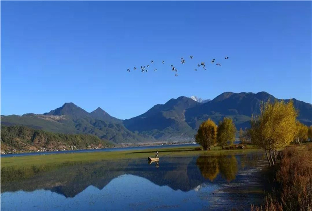 漫步拉市海濕地公園,藍(lán)天白云下,濕地里的小花和綠草在習(xí)習(xí)微風(fēng)中搖蕩,一梭魚(yú)船穿過(guò)花叢,水波輕輕地拍打水草,聲如天籟。