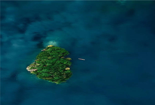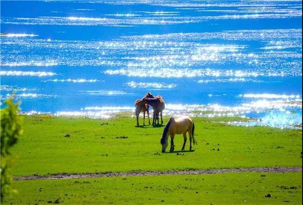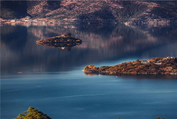 湖中坐擁數(shù)座小島,島上風(fēng)光旖旎,四面環(huán)水,海天一色,湖水廣闊無(wú)垠,岸邊群山環(huán)繞,蒼郁蔥蘢。