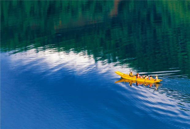 湖水波瀾不驚,光滑如鏡,遠(yuǎn)看是一片深藍(lán)幽光,近看可見(jiàn)清澈水底的水草,青山白云的倒影與湖水融為一體,這就是萬(wàn)物叢生的感覺(jué)吧。