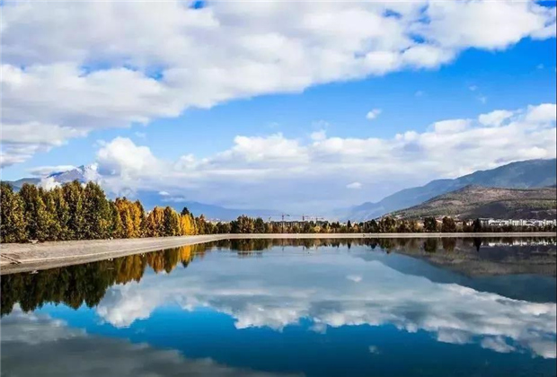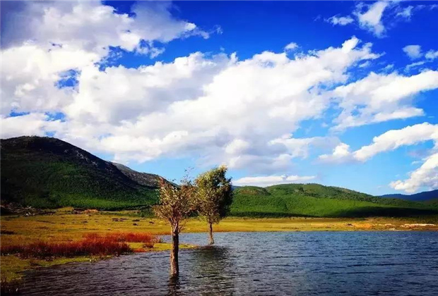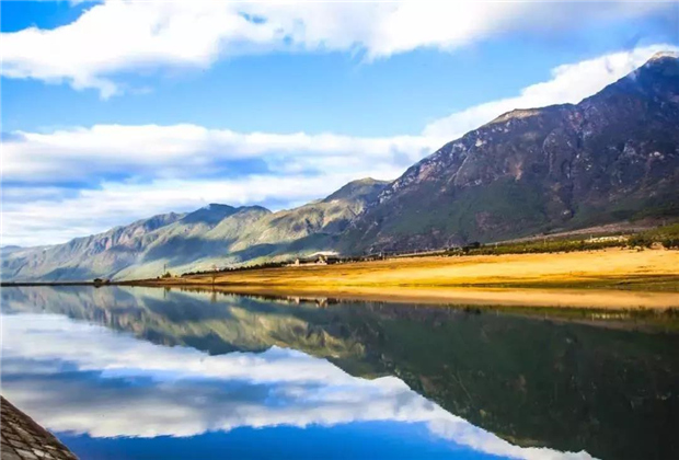玉湖中,雪水清澈,水草搖曳,藍天白云襯托著高大的玉龍雪峰倒映在湖中,大自然仿佛都沉淀在湖底。沒有都市的喧囂,沒有凡俗的熙攘,你可以靜靜的吹著風,看著牛羊,感受遠處飄來的清新花香。