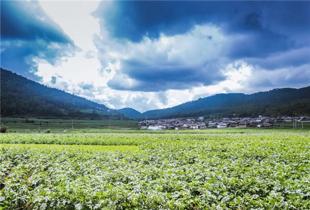 前有雞冠山,后有文筆峰,四周被大大小小的群山包圍著,一路柏油路暢通,洋芋花環繞村莊,清風細雨滋養著他們,美得青翠欲滴,村莊煥發出青春活力……