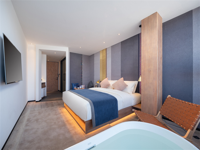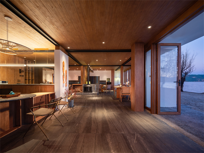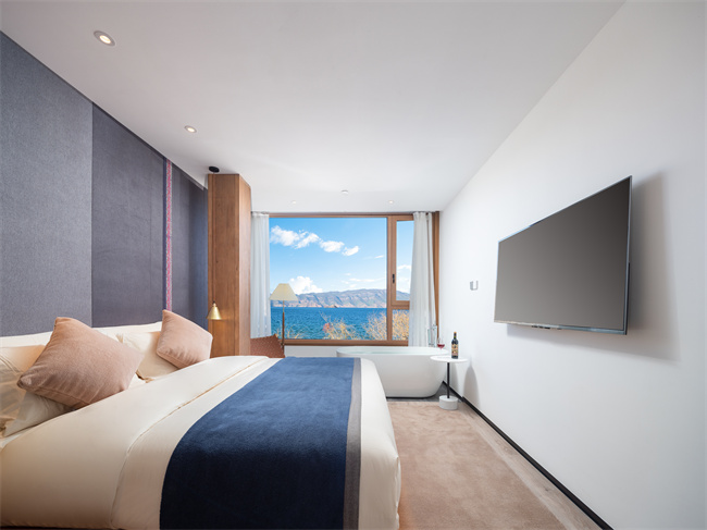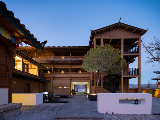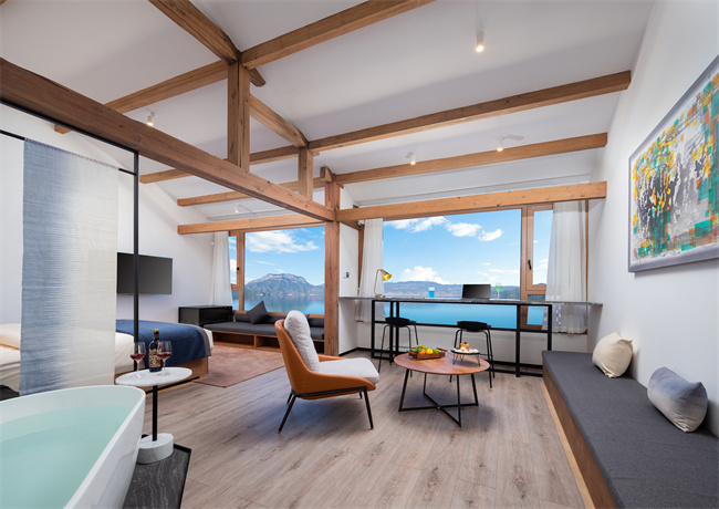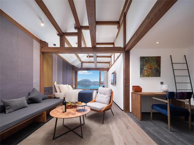 跟著麗江小眾民宿,瀘沽湖小眾民宿,瀘沽湖高端民宿,瀘沽湖野奢民宿,瀘沽湖湖景民宿,瀘沽湖設計師酒店小編一起來看看吧!匠廬悠藍,位于山湖彼端的摩梭小屋,它像極了盧梭筆下的“瓦爾登湖”秘境。民宿以當地摩梭人傳統木屋為靈感,將民族特色與現代極簡很好的運用在室內外的設計裝修上,外墻選用當地的老梁木、夯土鋪設而成,散發著質樸的氣息。遠遠看過去,像漂浮在瀘沽湖面上的摩梭人家。設計師對空間流線的推敲和留白,將書吧、接待區、餐廳巧妙分開,而長廊兩側的水景和端頭的秋千讓房屋與湖景的關系更顯得靈動有趣。房間內的擺設、用品講究,注重收納,每間房的窗開得很大,一轉眼就是遠處的青山白云和優美的湖景。一樓的公區都是落地門,均可打開通向瀘沽湖岸邊。在這里,住客可以坐在吧臺點一杯飲品和店里的管家親切交談,也可以隨時走向湖邊喂海鷗。2021年開業,總共有12間房。