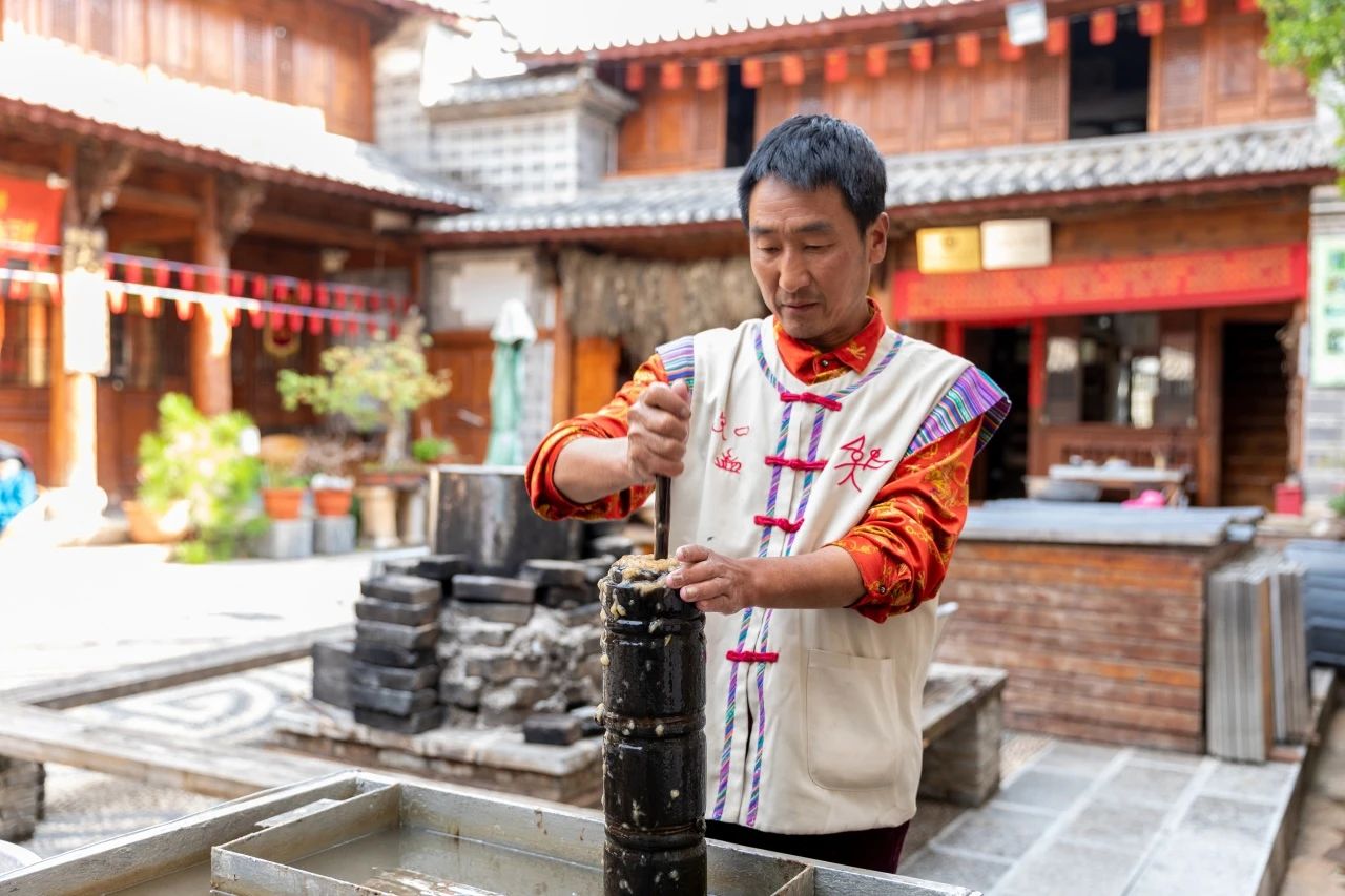 納西漢子和秀昌,大東巴和自強(qiáng)的后裔,是家傳第六代造紙藝人,也是省級(jí)非遺傳承人,在這里日復(fù)一日地做著同一件事情——做東巴紙,同時(shí)也向來自國(guó)內(nèi)外的游客一遍