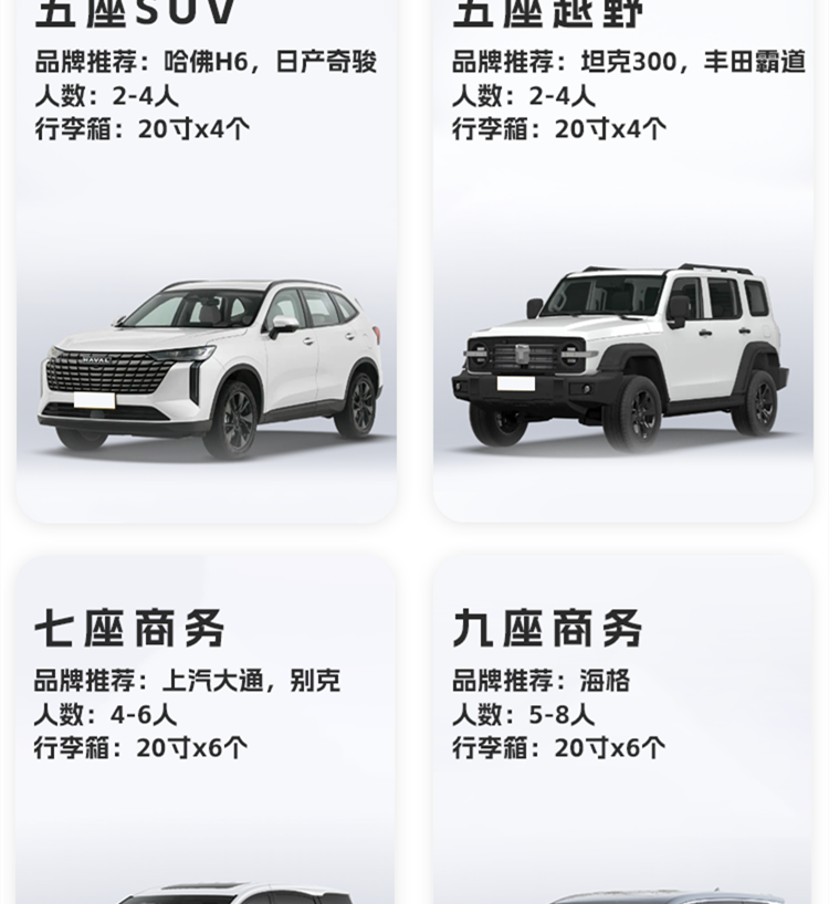 一般情況下2-3人建議選擇轎車/SUV出行,