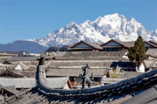 玉龍雪山在屋檐上若隱若現,銀冠映照著青瓦,宛如老東巴蘸著雪水書寫的象形文字,神秘而古老,讓人心生敬畏。