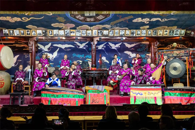 夜幕降臨,燈籠如同散落在硯臺中的朱砂,次第亮起,為古城披上了一層神秘的面紗。從某座四合院中飄出的洞經音樂