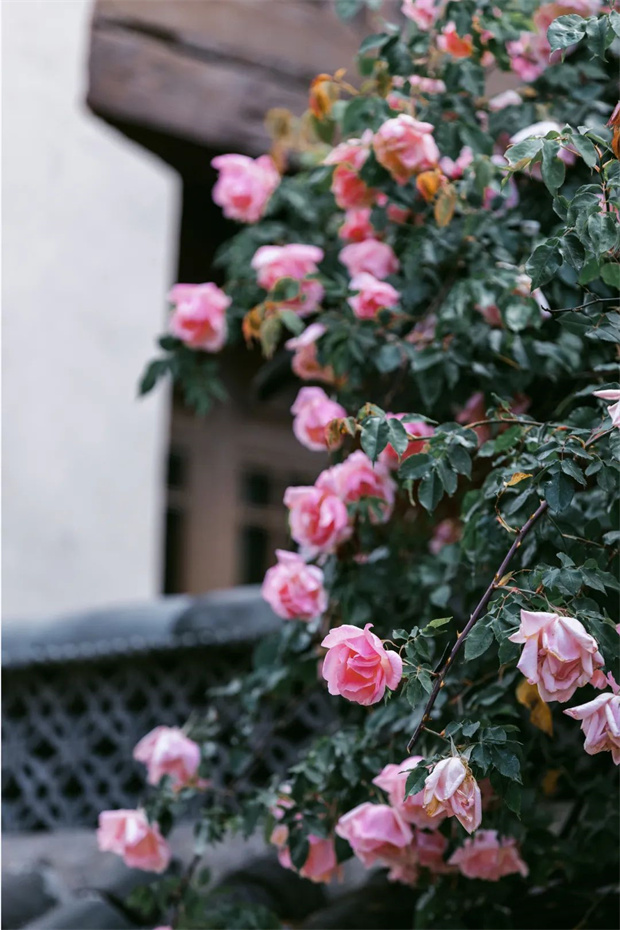 最令人稱奇的是它野蠻生長的姿態。在江南需精心呵護的月季,到了麗江竟顯露出驚人的生命力——一藤便能成景,孤