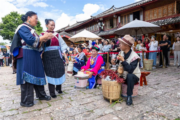 踏入麗江古城四方街,仿佛步入了一幅生動鮮活的市井長卷。每天下午4點,隨著古樂漸起,《古城一天》沉浸式情境