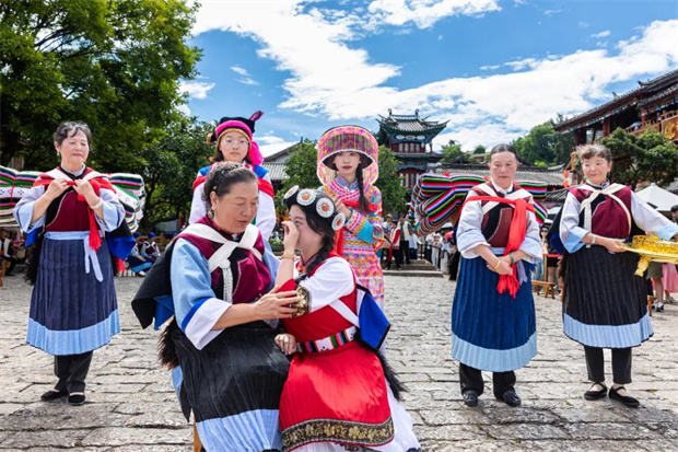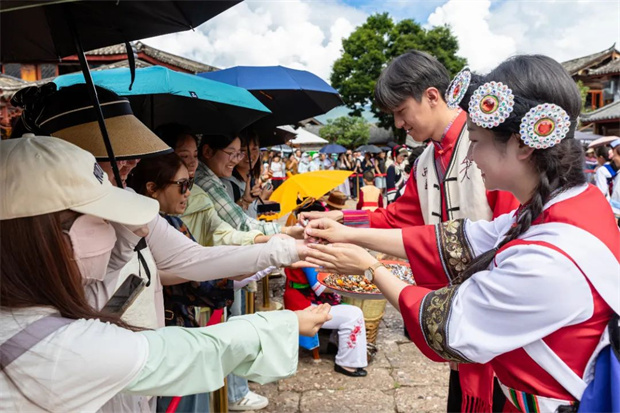 或許,你會品嘗到“新人”分發的喜糖,那份甜蜜與幸福仿佛也傳遞給了你;或許,你會被納西嬢嬢系上寓意著幸福與吉