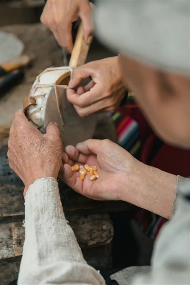 當(dāng)羊皮繩即將把鼓面封口時,李文先鄭重放入幾粒飽滿的玉米——男鼓九粒,對應(yīng)開天的九兄弟;女鼓七粒,呼應(yīng)辟地