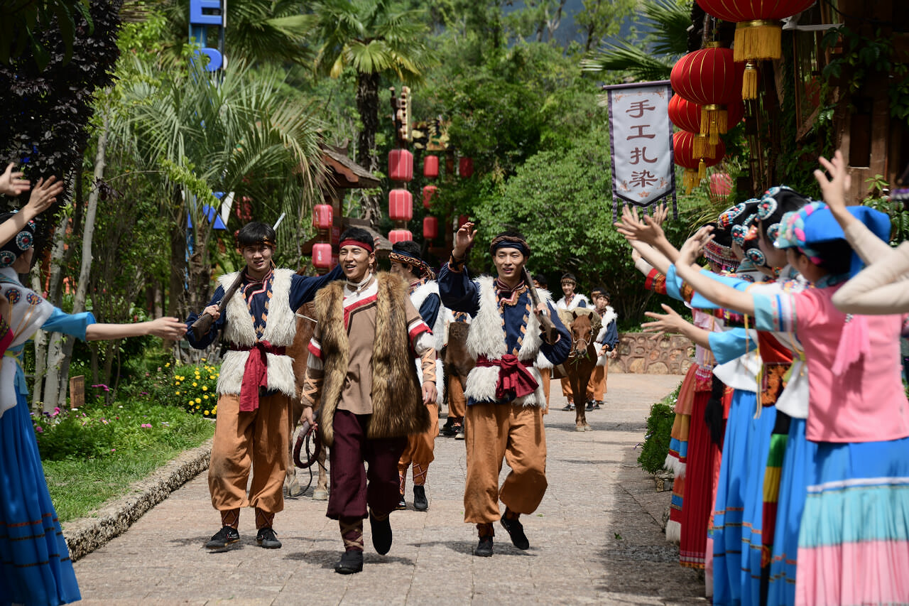 景區(qū)內(nèi)大型歌舞《麗江千古情》、大型實景演出《麗江戀歌》、實景體驗劇《大地震》以及《木府招婿》《鍋莊狂歡》等演藝秀輪番上演,精彩紛呈。
