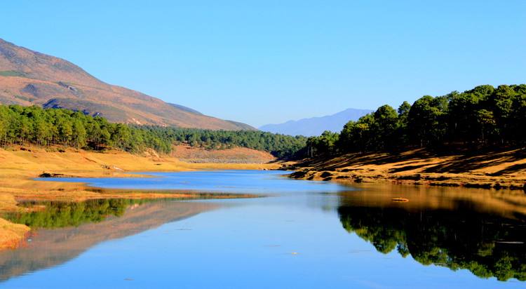 在云南省大理白族自治州北部靠近麗江的地方,有一塊狹長形的大壩子,叫做鶴慶壩子。壩子西側(cè)的高山腳下,矗立著的就是與壩子同名的縣城——鶴慶縣城。鶴慶壩子里分布著大大小小的龍?zhí)叮噙_上百來個,所以被稱為“龍?zhí)吨l(xiāng)”。尤其以大龍?zhí)丁⑽鼾執(zhí)丁ⅫS龍?zhí)哆@三個為佳,我們此次徒步的路線也就是三大龍?zhí)吨淮簖執(zhí)丁4簖執(zhí)叮挥邡Q慶縣東北部的辛屯鎮(zhèn)逢密村,緊鄰麗江三義機場,大龍?zhí)妒且粋€“西南--東北”走向的狹長形水庫,除了西南端的大壩之外,其余三面都處在青松環(huán)抱之中,生態(tài)環(huán)境及其良好,也少有人來打擾。