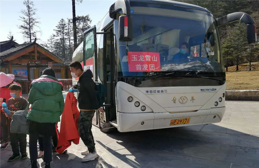 玉龍雪山銀裝素裹、麗江大地鮮花盛開。3月22日上午,麗江市多家旅行社在暫停經營旅游團隊業務59天后迎來首發團。“掃碼了嗎?身份證帶了嗎?座位上貼有請勿入座標志的,大家不要坐。”四輛大巴車前,游客有序地排著隊,導游和旅行社工作人員在挨個為游客測量體溫進行登記時,口中一遍遍重復著注意事項。在進行了簡短的首發儀式后,85名游客通過掃碼、測溫,分別登上了前往玉龍雪山、瀘沽湖和老君山的旅游大巴。