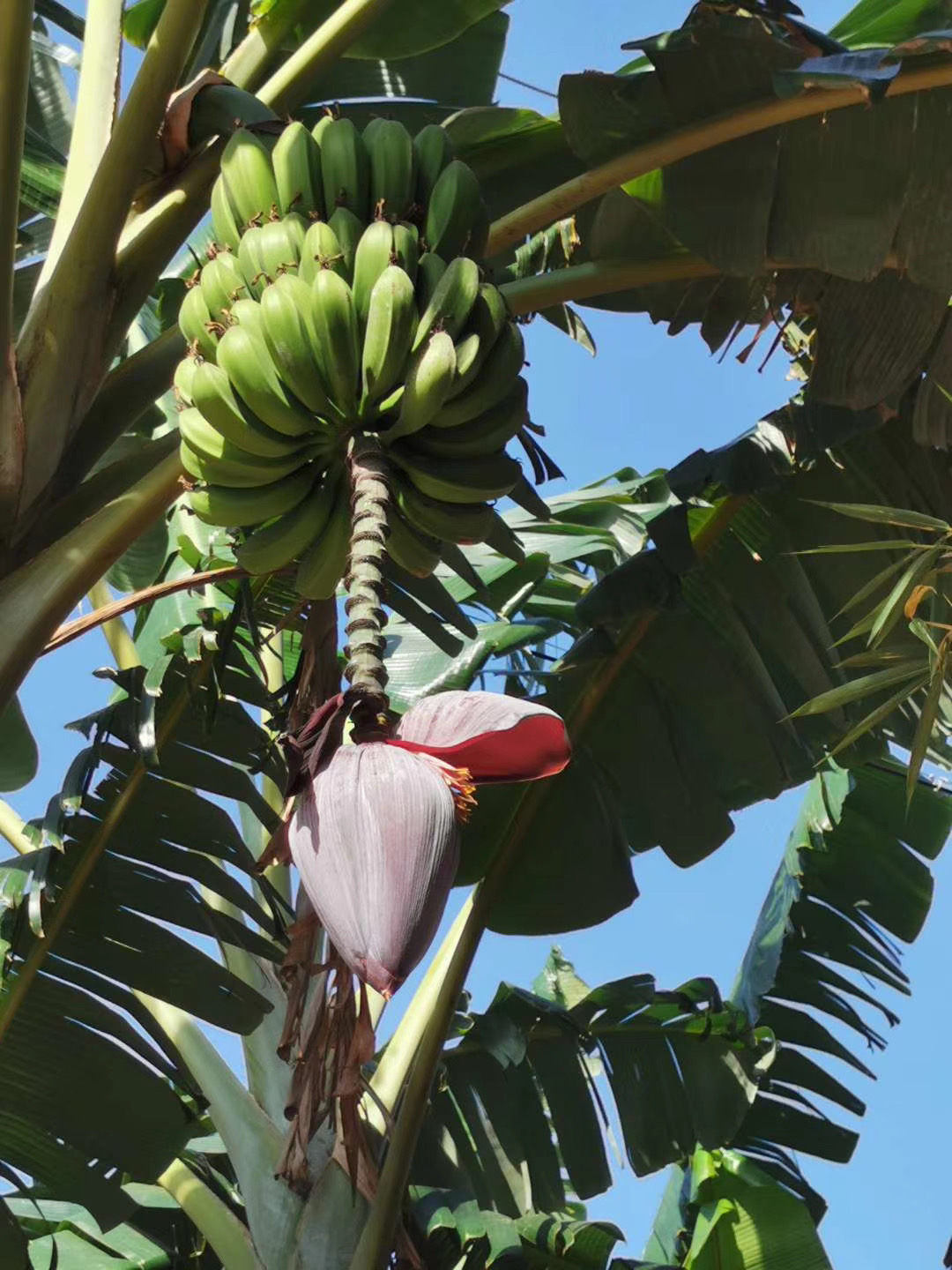 麗江芭蕉;芭蕉樹,是芭蕉科,芭蕉屬植物,常綠大型多年生草本植物。 植株高2.5-4米。葉面鮮綠色,有光澤;葉柄粗壯。原產日本琉球群島,我國臺灣可能有野生,秦嶺淮河以南可以露地栽培,多栽培于庭園及農舍附近。
