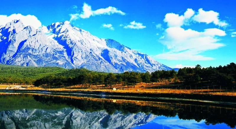 玉龍雪山主峰扇子陡海拔5596米,是世界上北半球緯度最低、海拔最高的山峰。它位于麗江西北,呈南北走向,東西寬約13公里,南北長約35公里,與哈巴雪山對峙,洶涌澎湃的金沙江奔騰其間。玉龍雪山在納西族被稱為“波石歐魯”,意為白沙的銀色山巖。整座雪山由十三峰組成,由北向南呈縱向排列,延綿近50公里,東西寬約13公里。玉龍雪山不僅氣勢磅礴,而且秀麗挺拔,造型玲瓏,皎潔如晶瑩的玉石,燦爛如十三把利劍,在碧藍天幕的映襯下,像一條銀色的玉龍在作永恒的飛舞,故名玉龍山。又因玉龍雪山的巖性主要為石灰?guī)r與玄武巖,黑白分明,故又稱為“黑白雪山”。