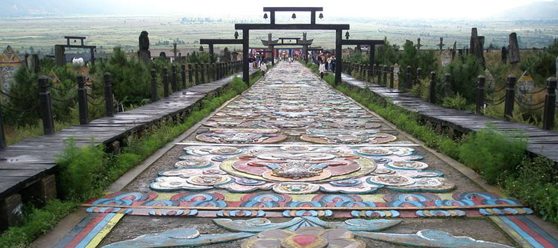 東巴萬神園是以弘揚和展現納西族古老神奇的東巴文化,再現人與自然和諧發(fā)展為主題的人文、自然旅游景點。園內主要展示了東巴教藝術中的輝煌巨著——“神路圖”,充分表現了納西族哲學觀念中的“神界”,“人間”,“鬼域”所構成的世界。“神路圖”被譽為“環(huán)球宗教第一繪畫”,它長240米,寬6米,在園內直指扇子陡主峰,氣勢恢宏壯觀。整個園內還聳立著近千樽神情莊嚴自在,選形怪異奇特的納西木雕神祗、精靈以及木牌畫,圖騰柱等。其神靈形貌往往是人與自然界各種動物的結合體,生動形象地表現了人類文明童年時期詭怪陸離的精神世界,和對大自然深遂的觀察力和思索,并由此迸發(fā)的神奇想象力震撼心靈,給予人們奇妙的力與美的享受。
