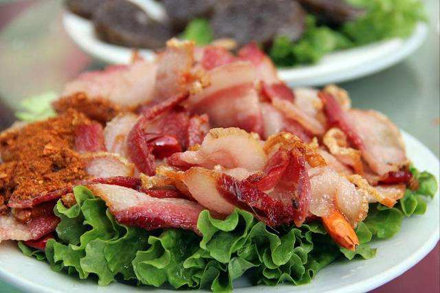 納西烤肉,它的燒烤方式非常具有地方特點。它是用一個形似水缸的烤爐,中間部分堆滿碳火,烤爐的周圍用鐵絲拴著一圈掛肉的鉤子,腌制好的肉就掛在鐵絲上,只是看著就讓人口水四溢。它的主料則是由本地豬的五花肉切到適中的厚度烤熟。這樣烤出的豬肉,豬皮金黃松脆,肥而不膩,瘦而不柴,口感松脆,蘸著當地的辣椒粉,上面放著油炸的薄荷,吃起來那叫一個夠味。麗江幾乎各個飯店小餐館都可以做,而且做法也一致。