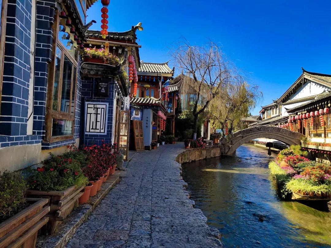 走入這條路后,好似進入了一個新世界,清透的藍色天空下,花兒開沒了小路,一座小橋,一條小河,戶戶人家,如詩如畫般的街道竟在古城中存在。
