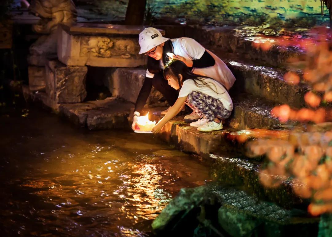 夜幕來臨,拿著河燈的納西姑娘來到了河邊,許多游客也加入了其中,只見他們將河燈緩緩放入水中,飄蕩在水面上的河燈帶著人們的美好祝愿,隨著河水漸漸遠去。