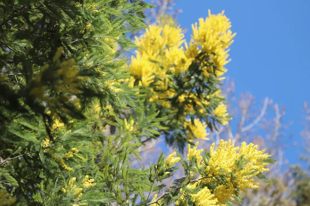 穿梭于銀荊樹下,那一簇簇的小黃花隨著視線變得清晰了起來。毛茸茸的像一群小黃人在樹枝上跳著歡快的舞蹈。耳邊似乎響起了周杰倫的《晴天》:故事的小黃花,從出生那年就飄著......