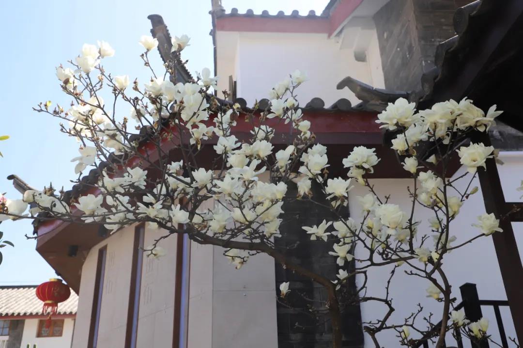 木蘭,俗稱“望春花”,麗日晴空下,蠢蠢欲動(dòng)的花苞,遍是春日的爛漫與多情。馥郁的香氣與每一個(gè)被春風(fēng)喚醒的靈魂暖暖相遇。木蘭花的盡頭便是古城的入口之一。白墻青瓦的一側(cè),一顆白玉蘭開的亭亭玉立,詩人說這是人間玉樹。一樹雪白,若無旁人,花開無塵。