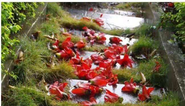 有人贊木棉是英雄樹,是君子花。除其蒼勁昂揚、筆直偉岸的身軀外,大概也因其花開得熱烈,落得也壯烈。花期一過,木棉花絕然落土。樹下落紅無數,但花不褪色、不萎靡,依然保持著在枝頭的形色,不容半點凋零。當代詩人舒婷也為之贊嘆。