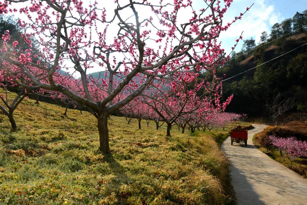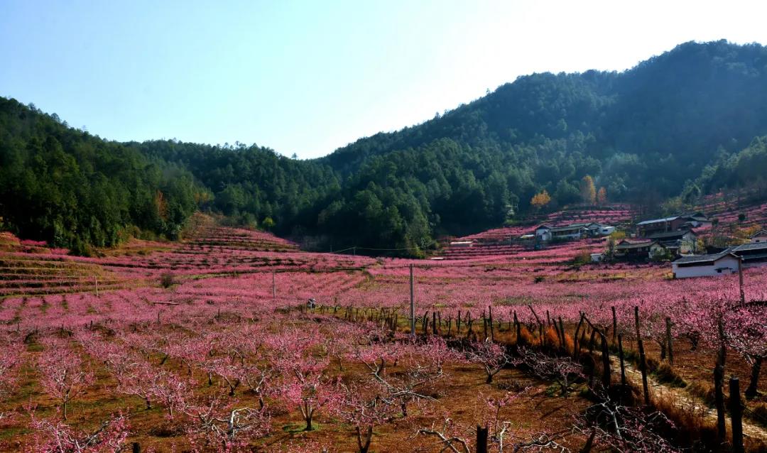 當你走進檢木科小組(吉北科),第一眼看到的是紅燦燦的桃花。沿路兩邊的桃花競相盛開,爭奇斗艷。從半山腰看雪桃園,桃花的身影分外妖嬈,似乎是從天上掉下來的一大片朝霞。而整片桃花與青山綠水、粉墻黛瓦的村落民舍相互掩映,構成一幅美妙的春天鄉村畫卷。
